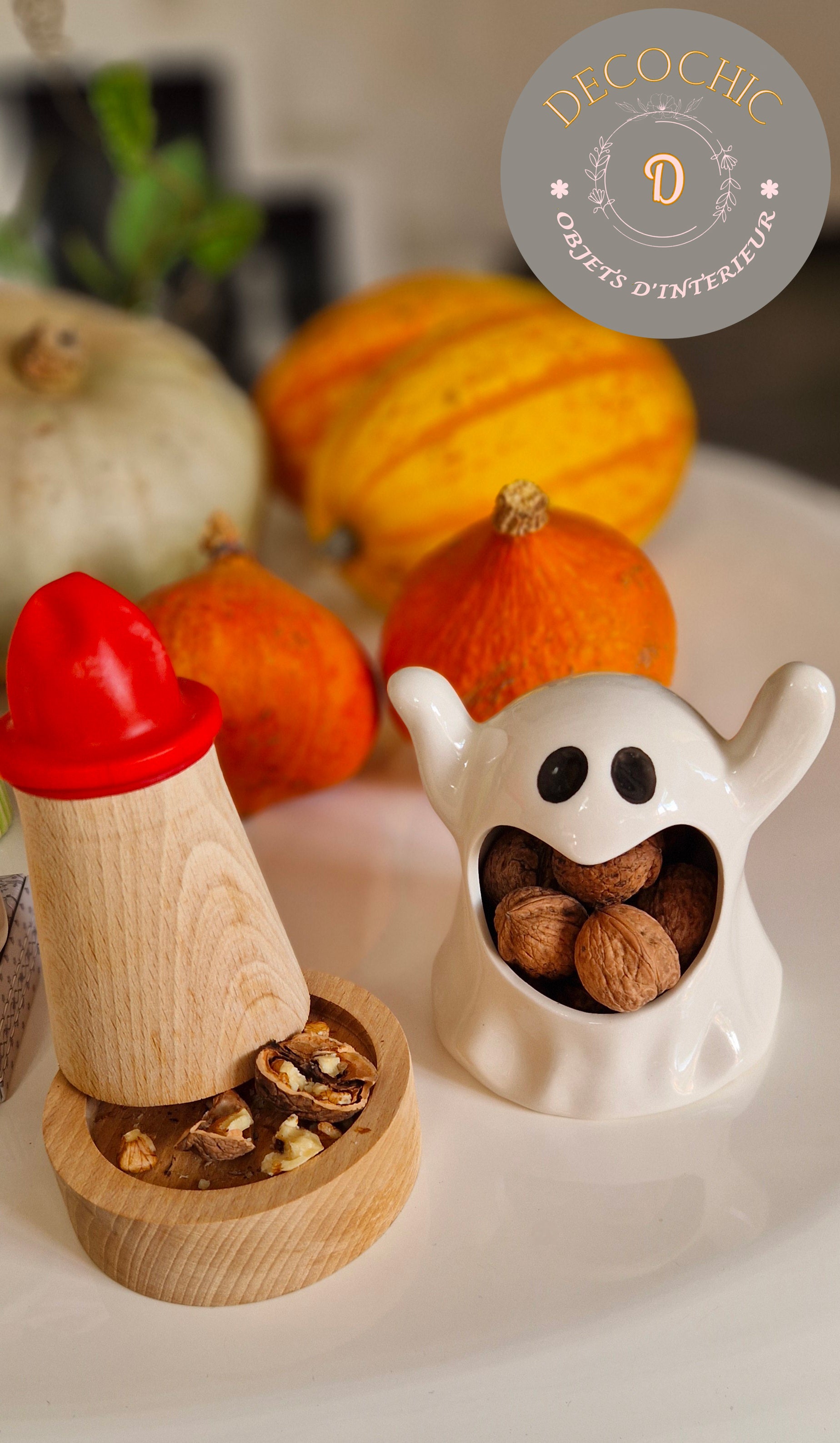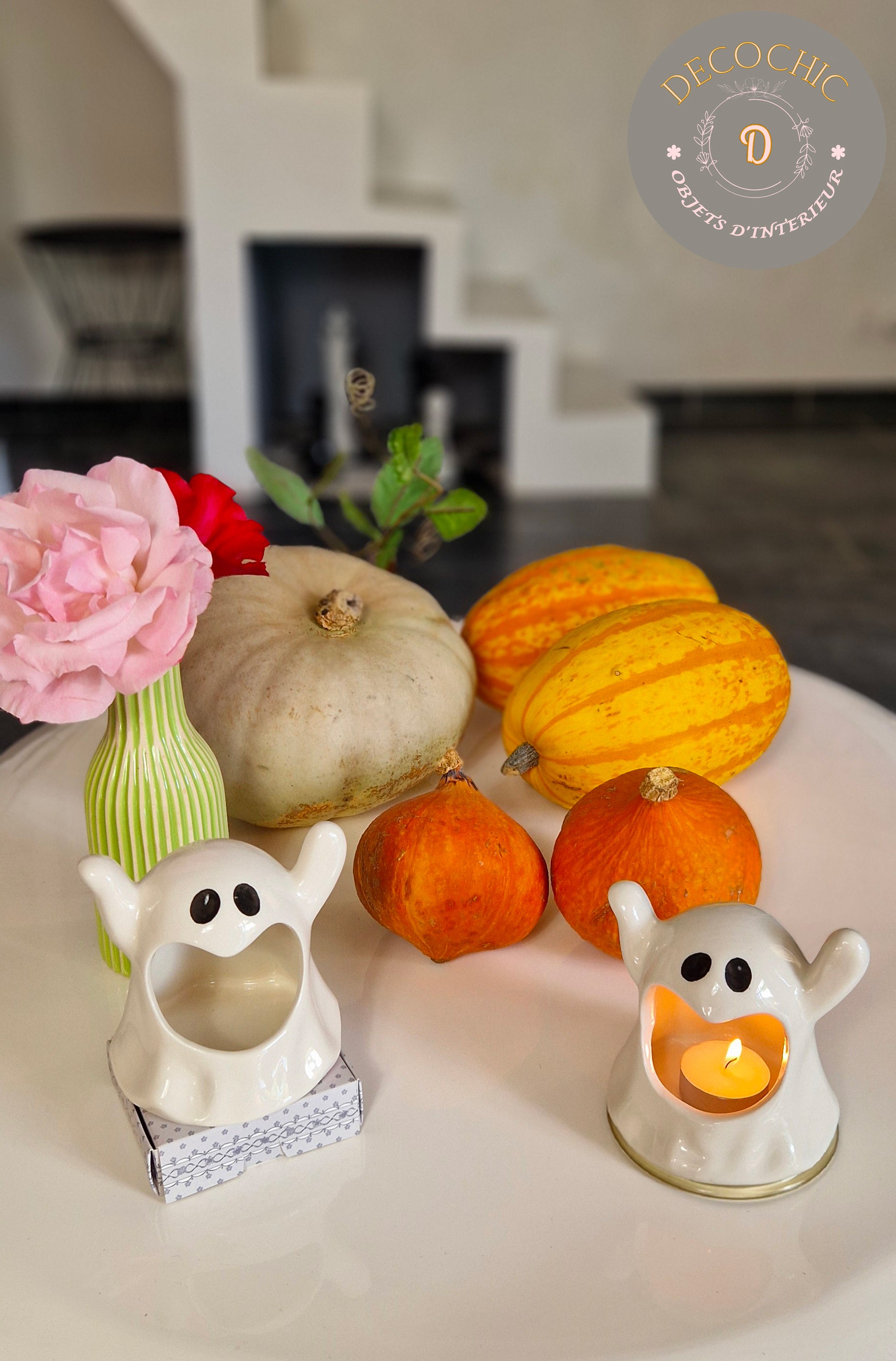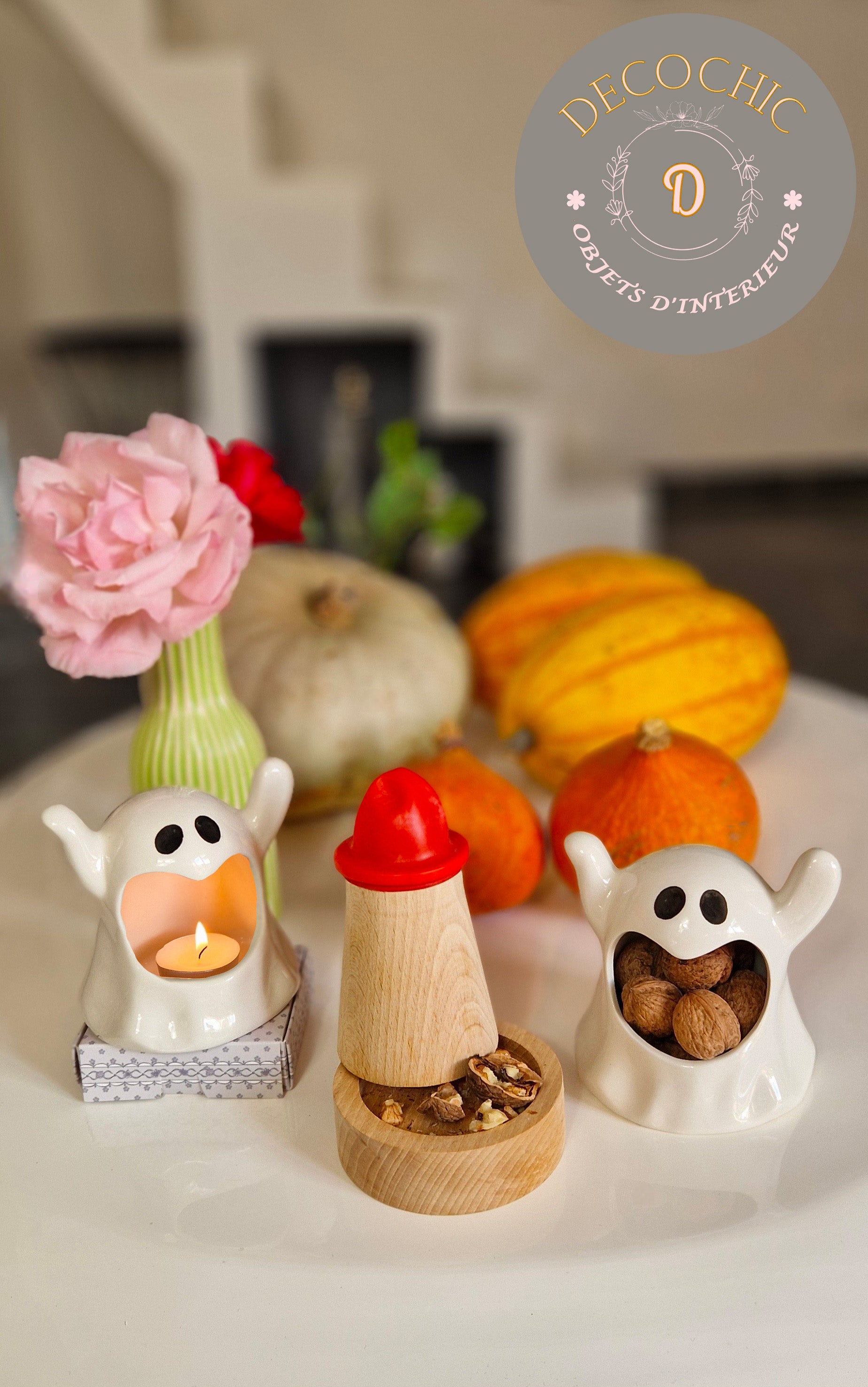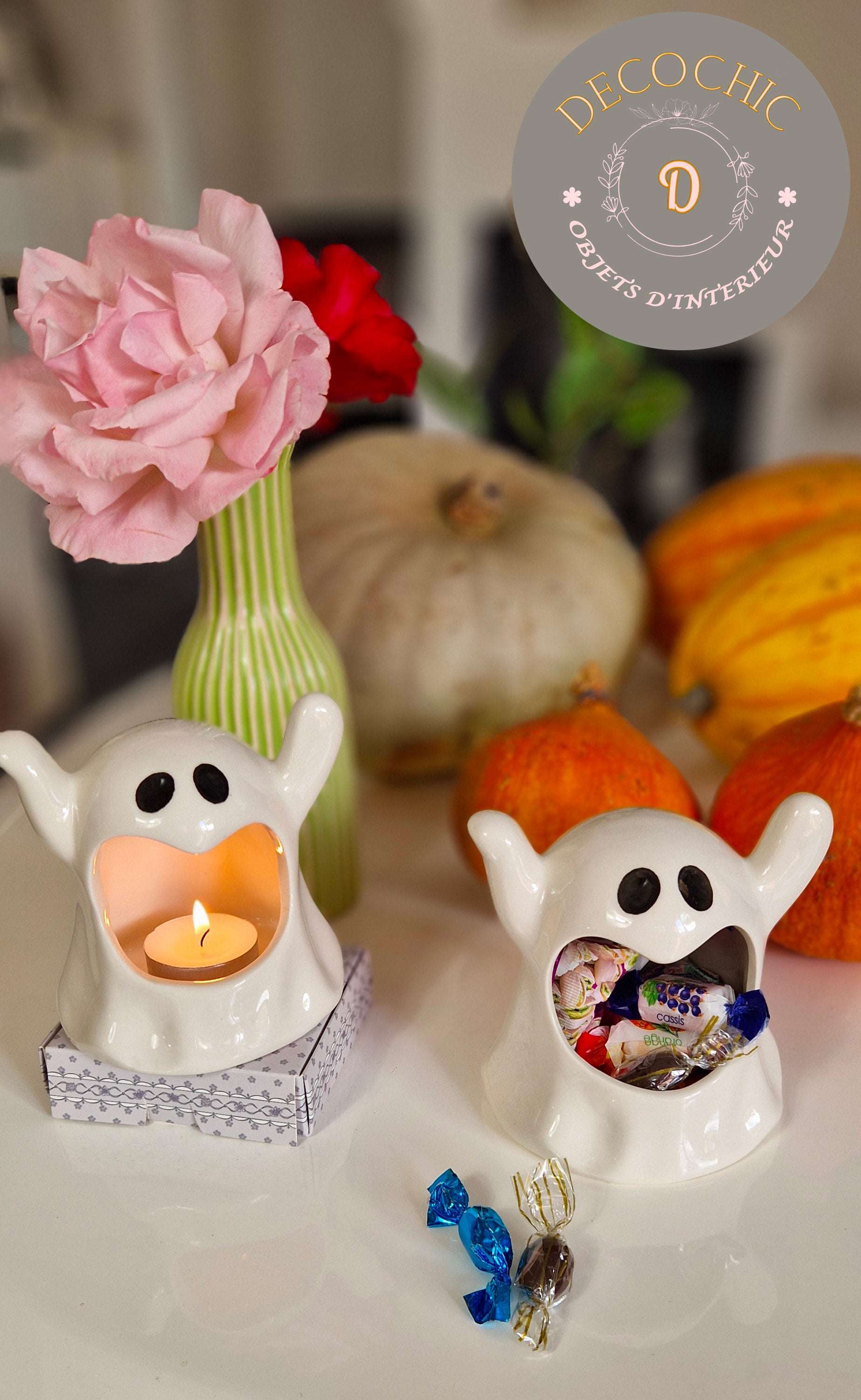 Ajoutez une touche festive et amusante à votre intérieur avec ces fantômes en céramique, disponibles en photophore () et en pot à bonbons (idéal pour fruits secs, bonbons ou comme vide-poches). Leur design mignon et leur polyvalence en font des accessoires parfaits !