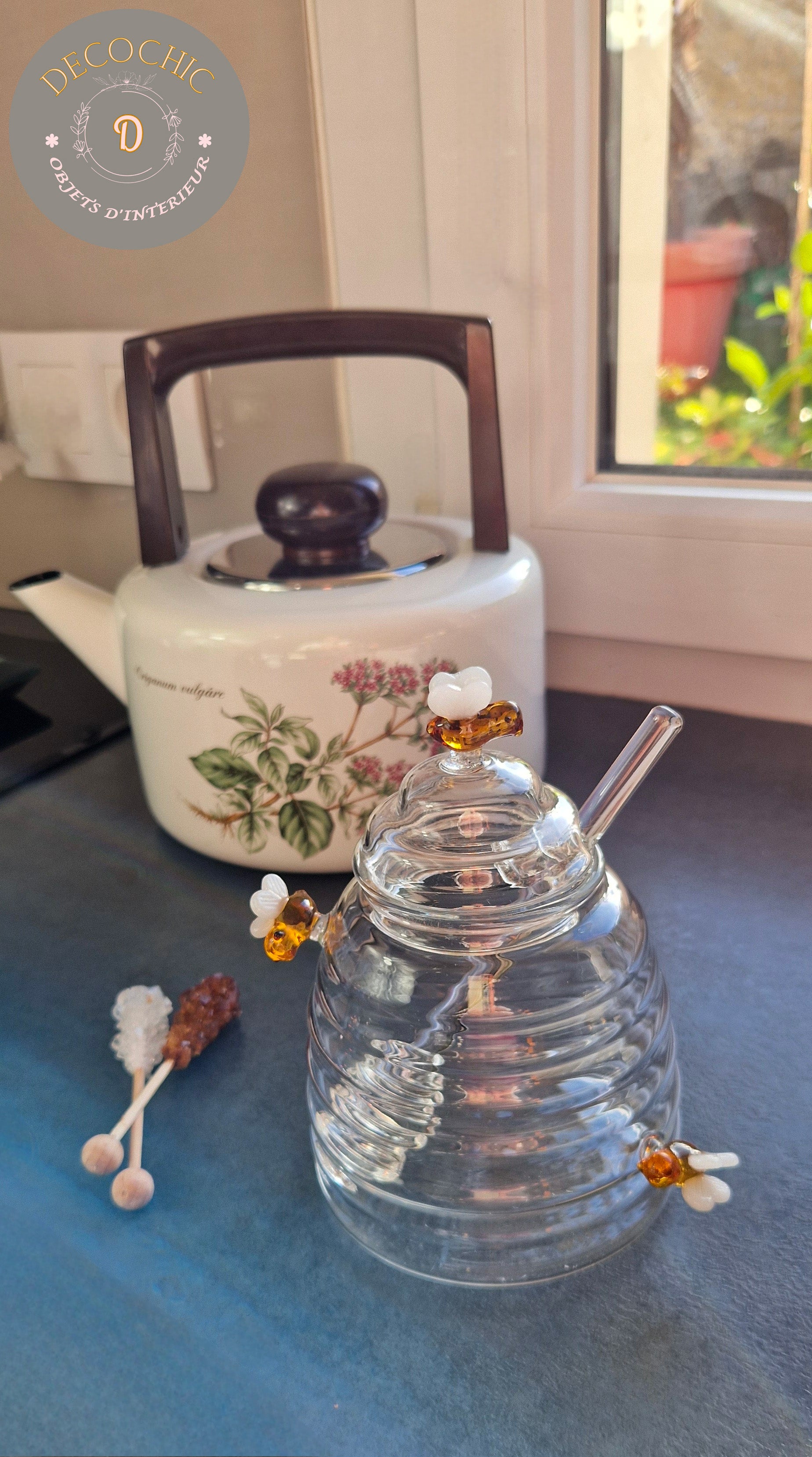 - Détails charmants : petites abeilles en verre pour une touche poétique.