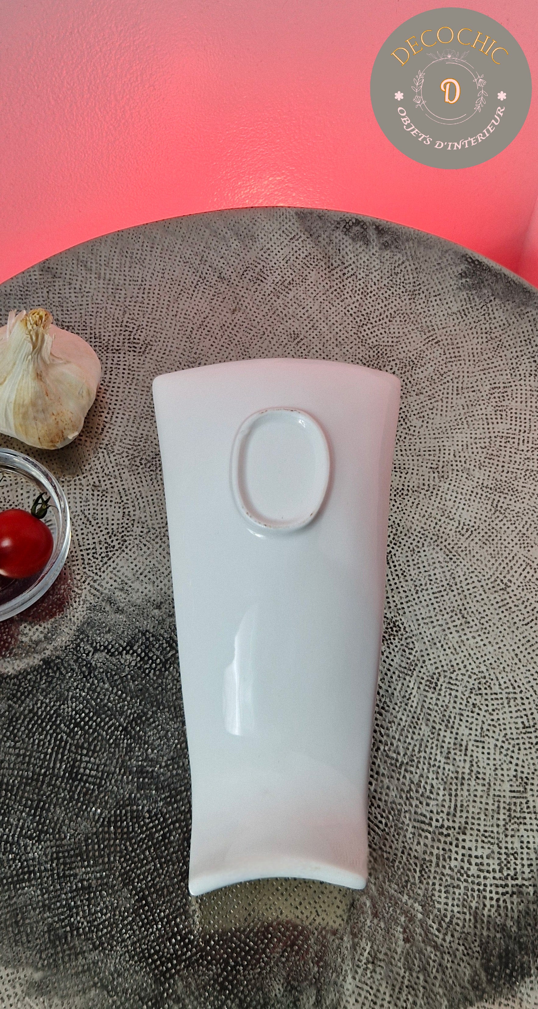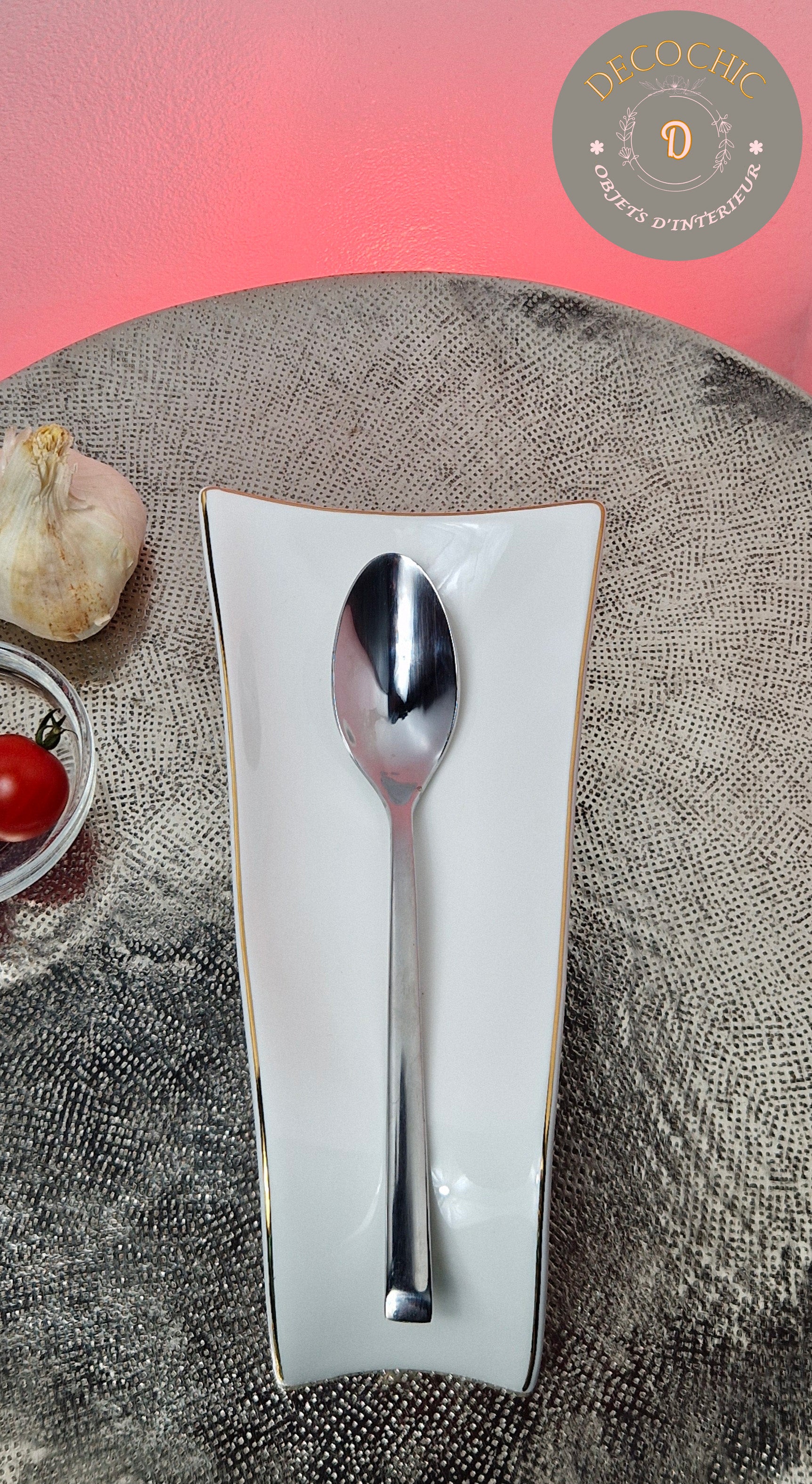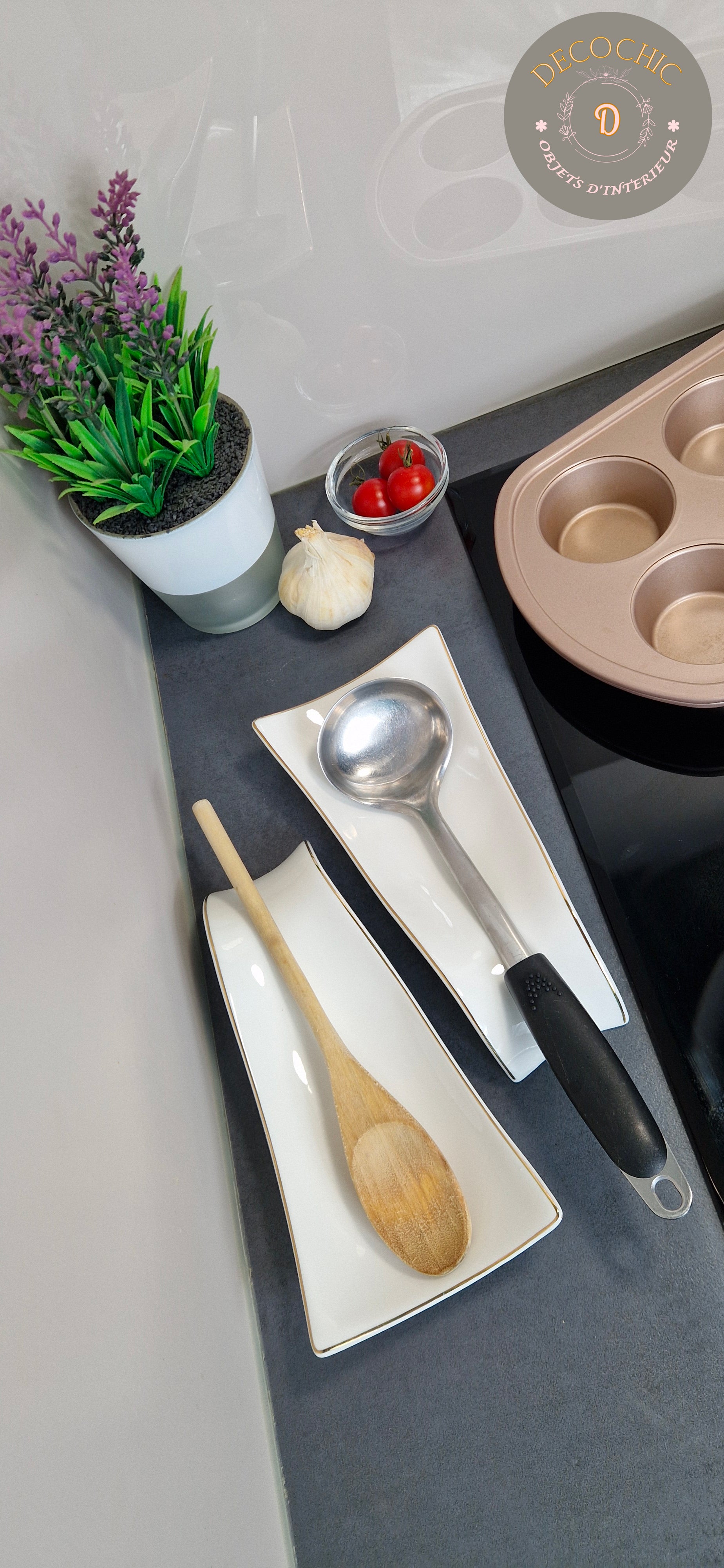 Apportez une touche d'élégance et de sophistication à votre cuisine avec ce repose-cuillère en céramique blanche, rehaussé d’un liseré doré. Son design épuré et ses finitions luxueuses en font un accessoire à la fois pratique et décoratif, parfait pour poser vos cuillères ou ustensiles tout en sublimant votre plan de travail ou votre table.