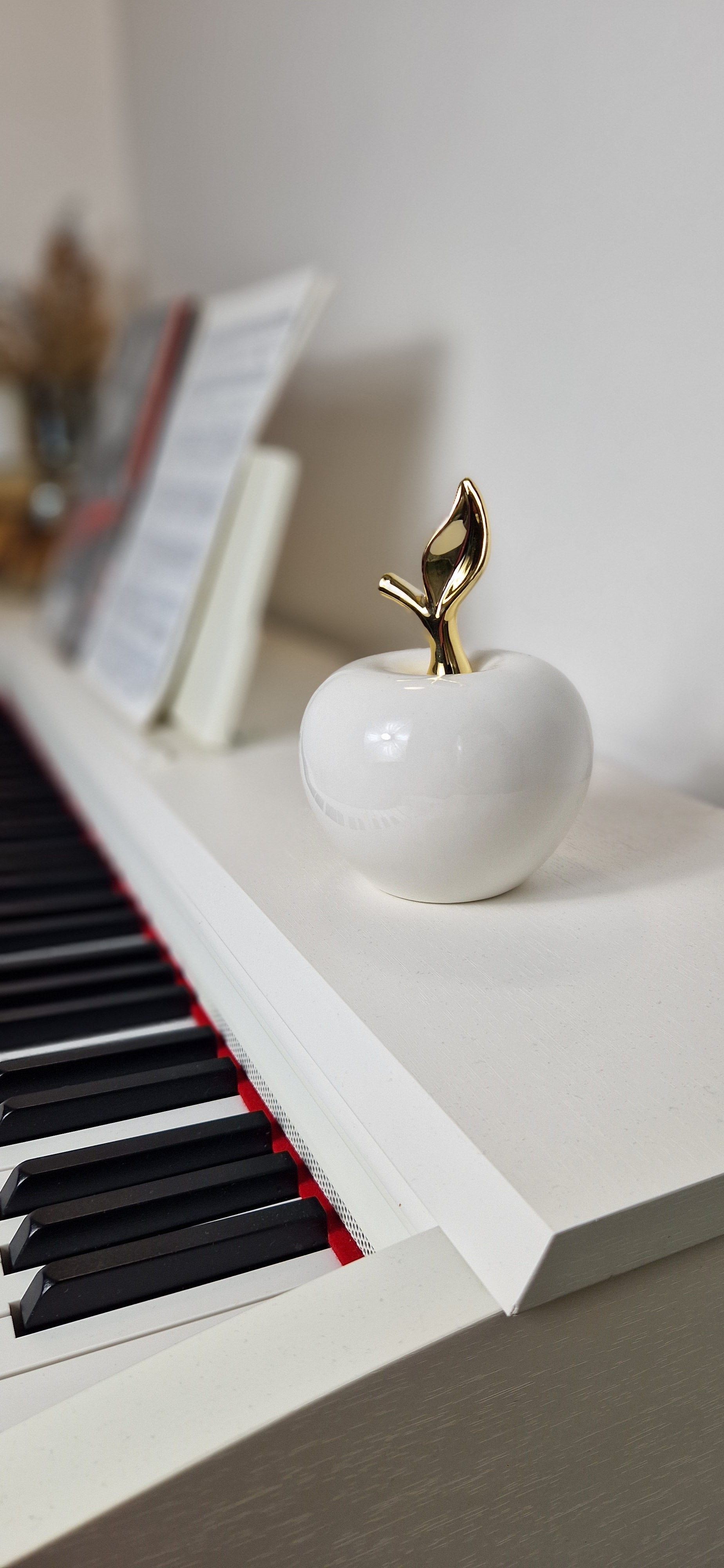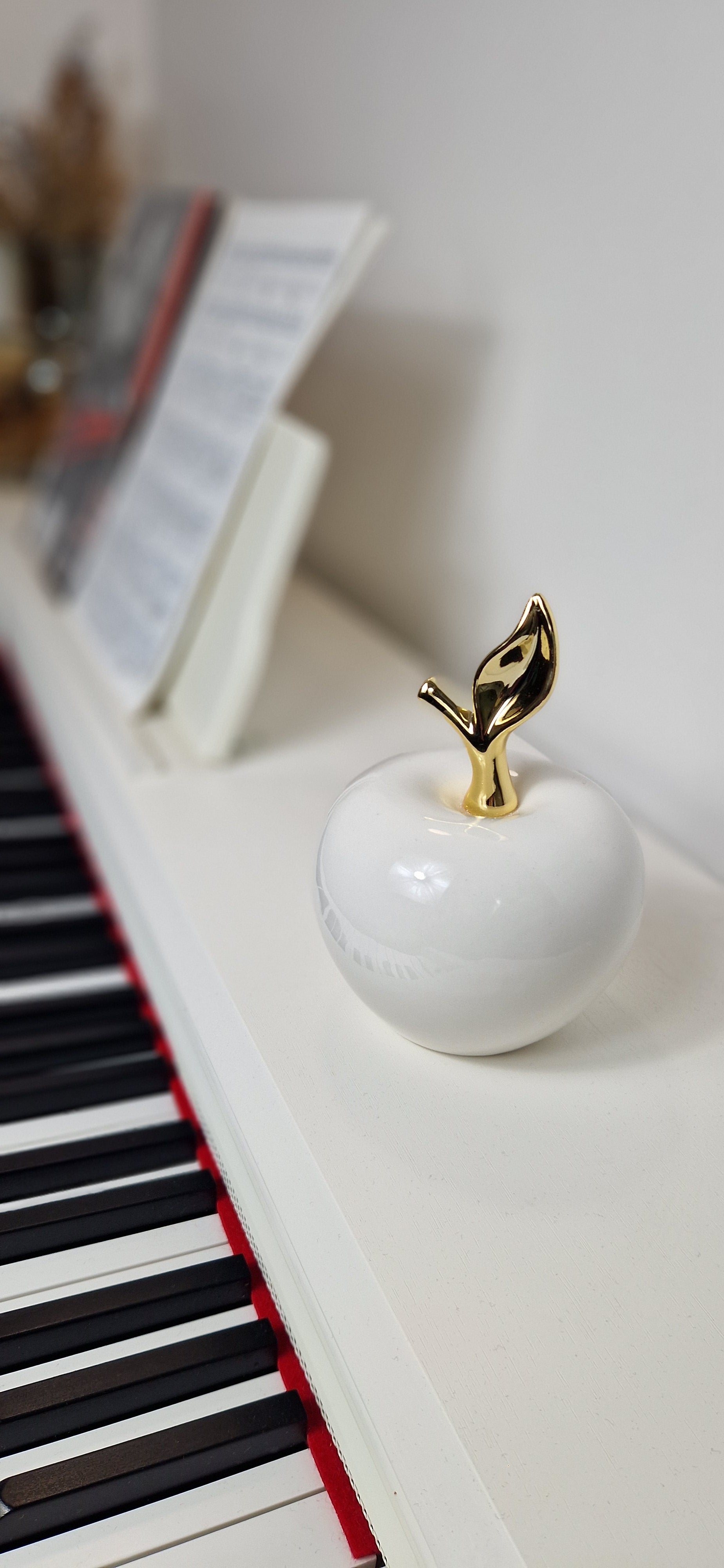 Apportez une touche de raffinement et de modernité à votre intérieur avec cette sculpture en céramique émaillée, représentant une pomme stylisée et une sphère. Son design épuré, ses finitions brillantes et ses détails dorés en font une pièce décorative intemporelle, parfaite pour sublimer vos étagères, votre table basse ou votre bureau.